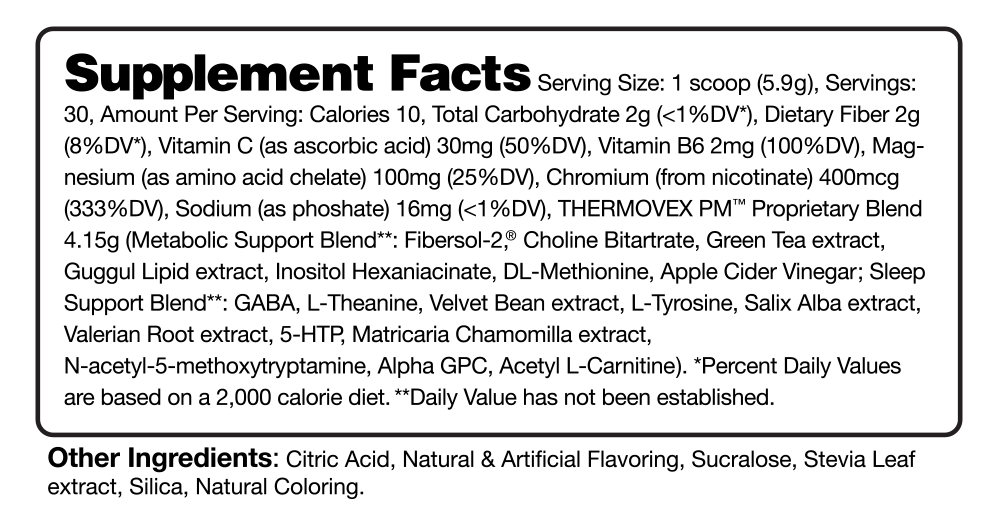You eat right, you train hard and you’re not afraid to put in the work. You also know the importance of getting enough quality sleep to support your goal of achieving that lean and mean physique is a must! Missing this critical component can wreak havoc on your goals and your metabolism. That’s why choosing the right supplement before bed is so critical. THERMOVEX PM™ is a Sugar-Free, nighttime metabolic formula that addresses this common issue. Formulated with popular ingredients used by many fitness-minded individuals before calling it a night, THERMOVEX PM™ has quickly become a go-to supplement used regularly by loyal customers. Don’t waste another day of clean eating and a great workout to lack of sleep!