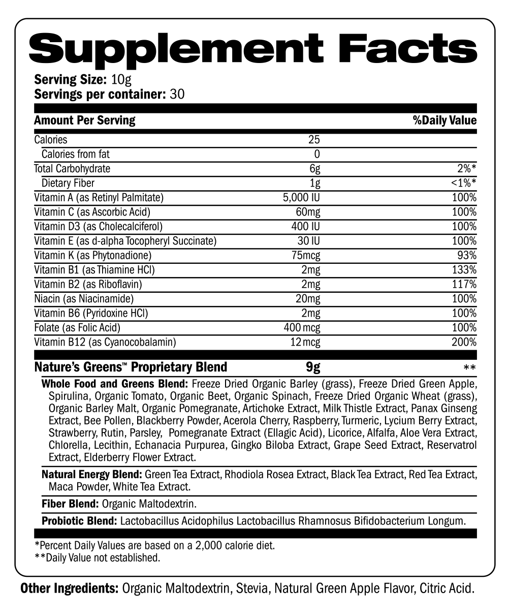 Let’s face it. Most of us do not eat enough of what is grown by nature on a daily basis. Yes, I’m talking about eating your veggies! You know, the green stuff! Problem solved my friends… Derived from freeze-dried juice powders, NATURE’S GREENS™ is a great tasting and convenient supplement formulated with 40 Superfoods including Spirulina, Spinach, and Wheatgrass to name a few. It contains No Artificial Sweeteners and No Artificial Colors! So go ahead, mix yourself up a tall glass of NATURE’S GREENS™, sit back and enjoy!