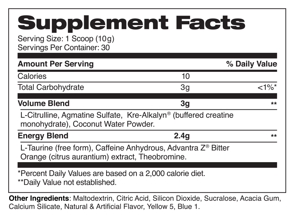 WARNING: Contains 300mg of caffeine per serving. This product is only intended for healthy adults, 18 years of age or older. Keep out of reach of children. Please consult your physician before taking if you have any pre-existing medical conditions or are taking any medication. Do not use if you are pregnant or nursing. Do not use if you are sensitive to caffeine or other stimulants. Discontinue use and consult your healthcare professional if you experience any adverse reaction to this product. Do not use if safety seal is broken or missing. Store in a cool, dry place. Packed by weight not by volume, settling may occur.