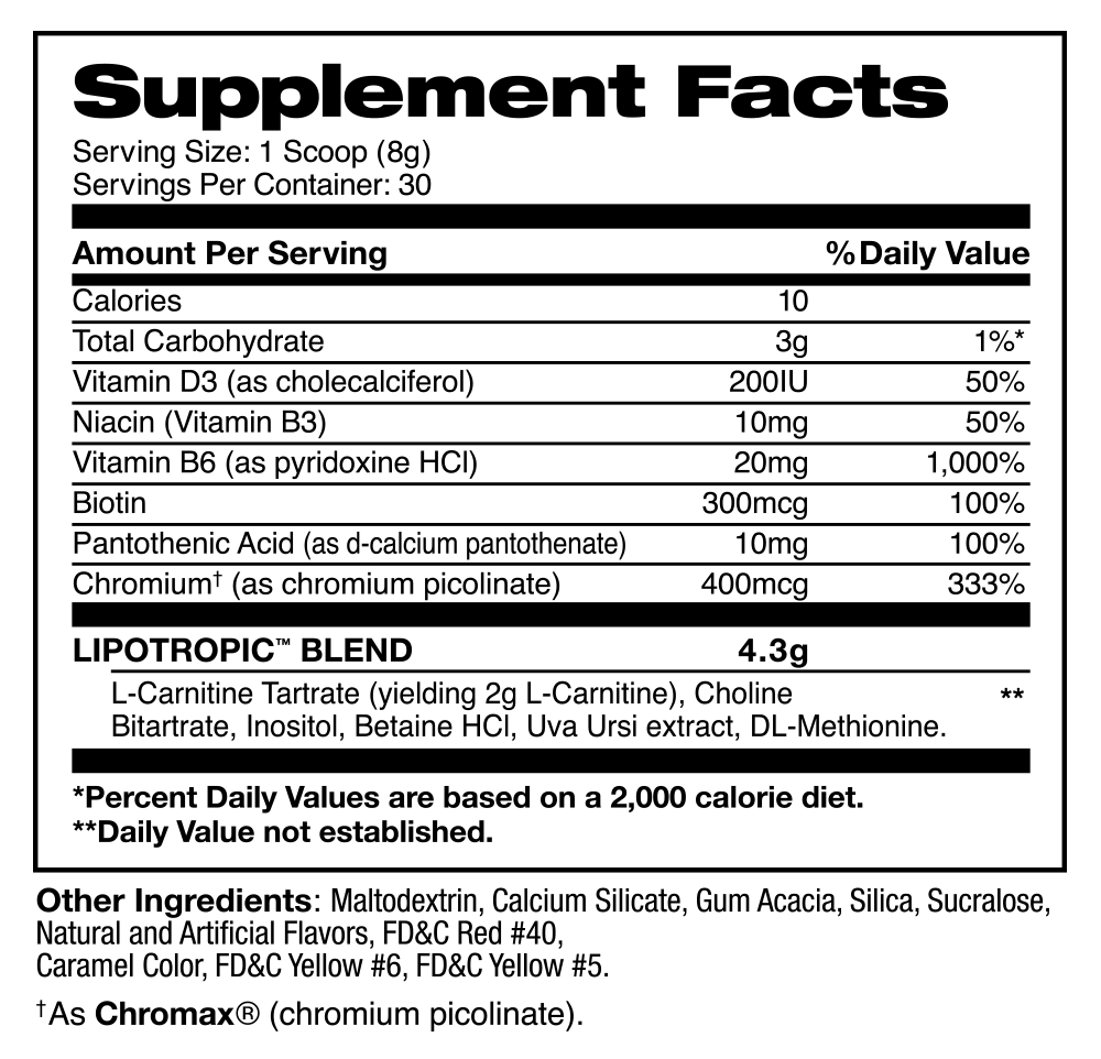 The sweat, the time and the devotion. It will all pay off!  Whether you sip it solo or stack it with your favorite pre-workout or thermogenic, let this stimulant-free, pre-cardio, metabolic formula take your cardio game to new heights! In addition to other sought-after metabolic ingredients found in LIPOTROPIC™, 1 serving also yields human studied dosages of L-Carnitine (as tartrate) and Chromium Polynicotinate. Try LIPOTROPIC™ 30 minutes before your next cardio session and get ready to sweat!  You will not be disappointed!